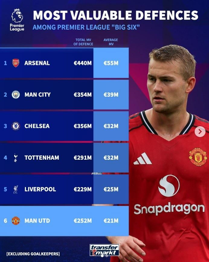 英超BIG6防线平均身价榜:阿森纳5500万欧居首,曼联2100万欧垫底